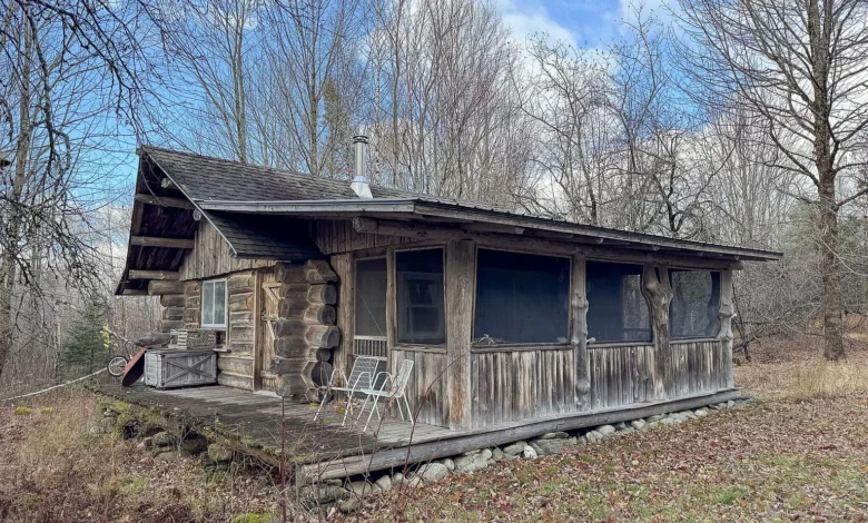 Built in 1994, the cozy log cabin sits along a town-maintained road and features a simple one-room layout with warm wood interiors and a welcoming front porch—an ideal spot to take in the surrounding wilderness.