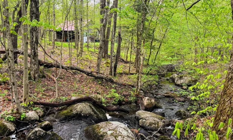 At the center of the property sits a traditional Adirondack hunting cabin beside a clear mountain brook. The cozy interior features an open layout with a kitchen, bunks, and a large wood-burning stove for warmth. A screened-in porch extends the living space outdoors, creating the ideal spot to unwind and take in the sights and sounds of the forest.