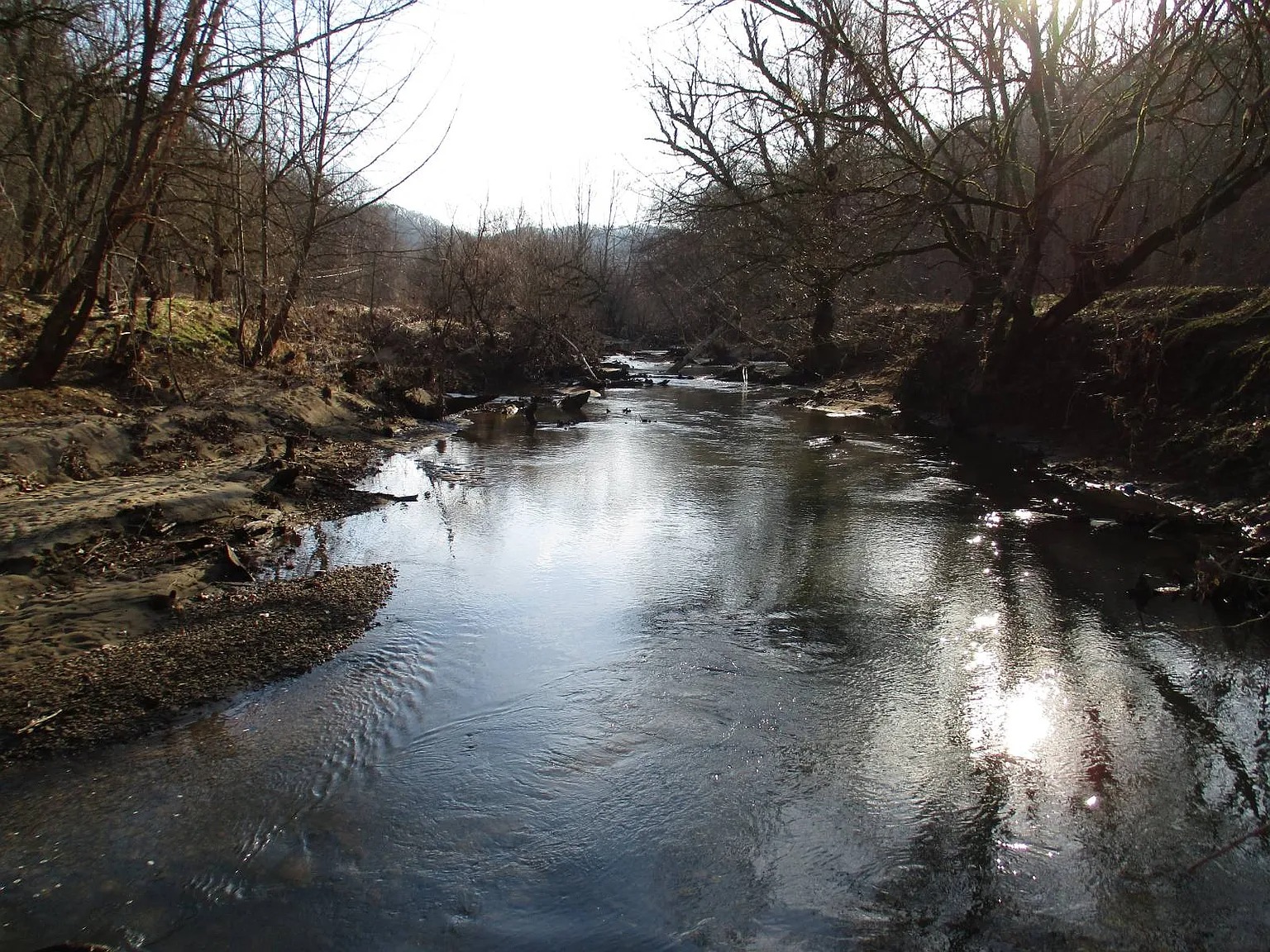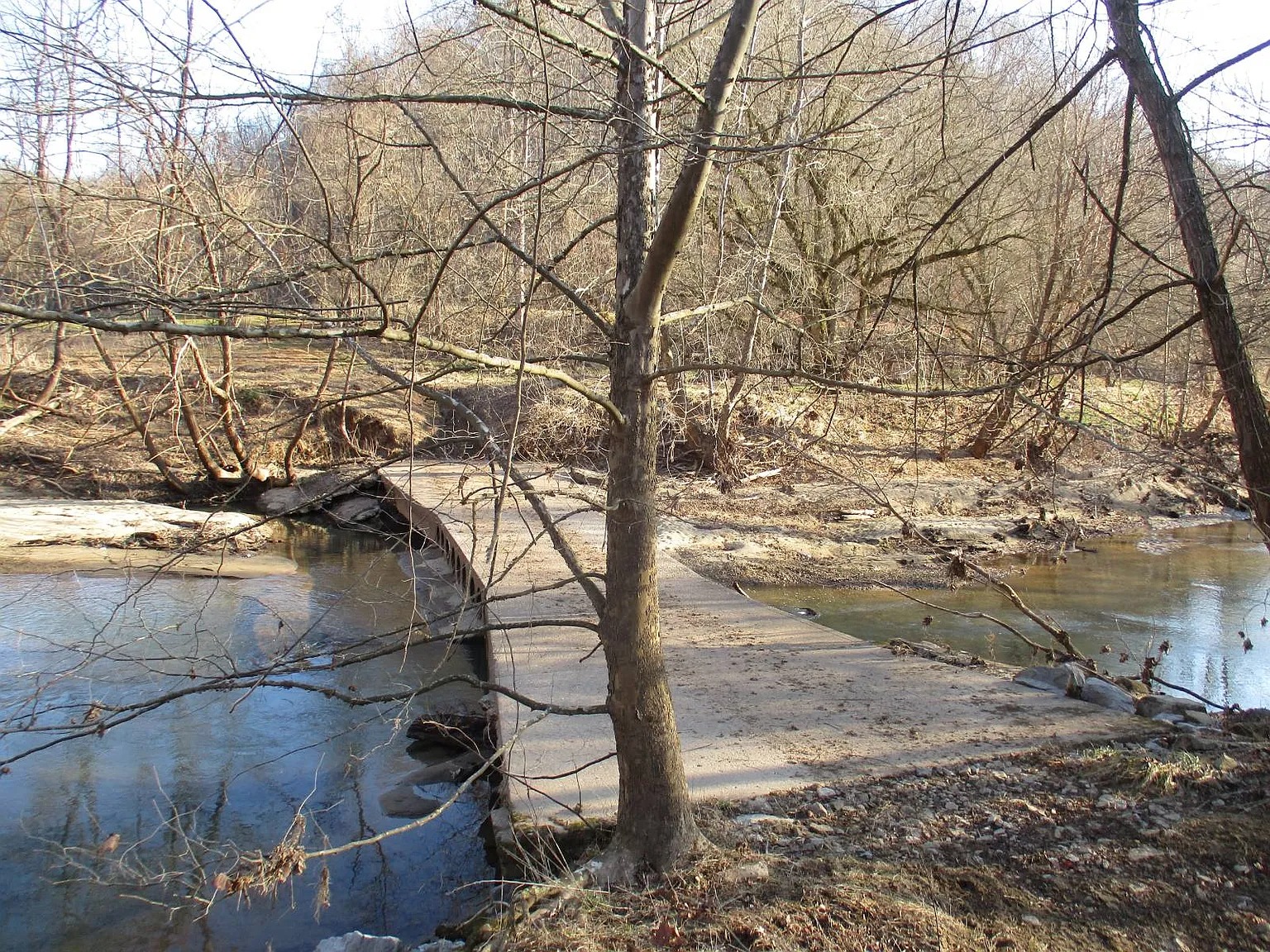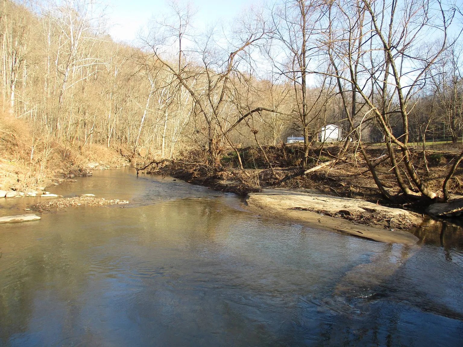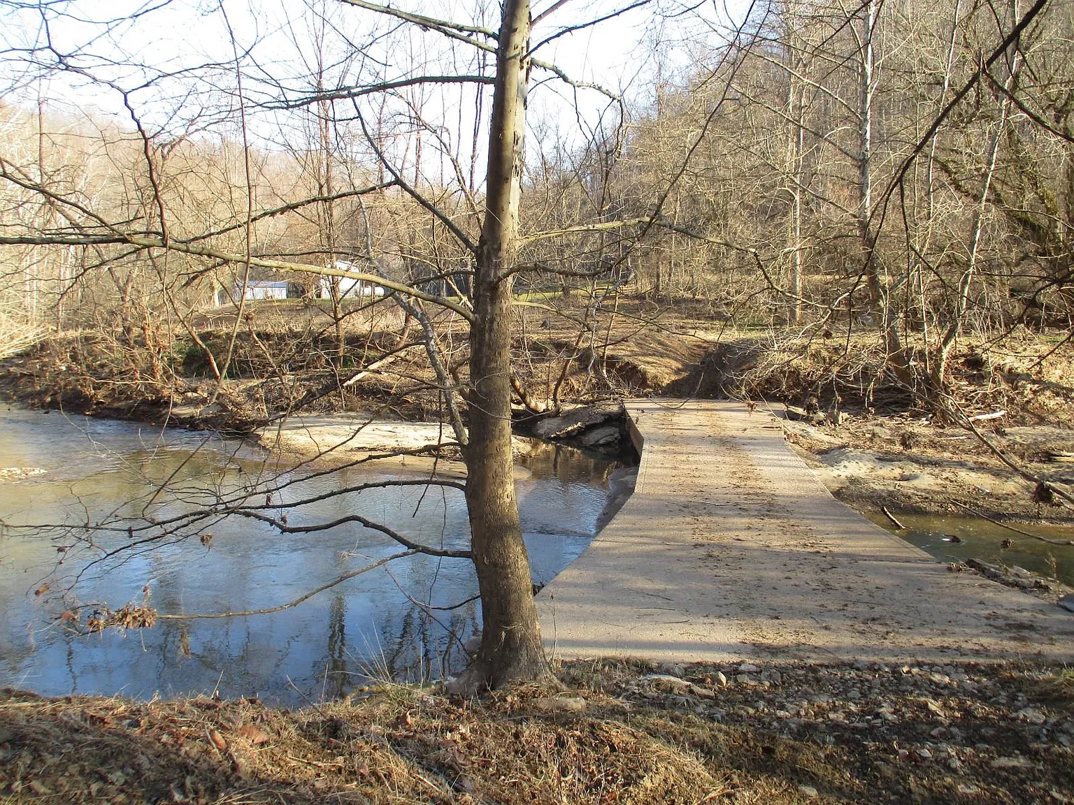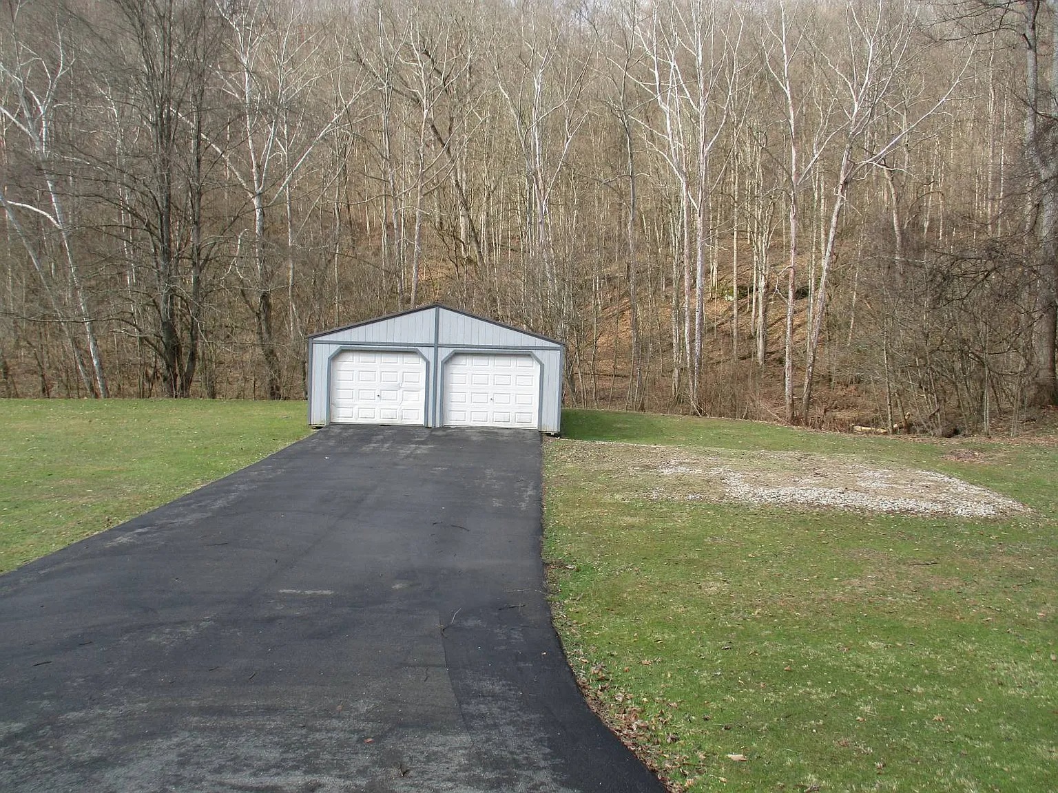 Furthermore, a detached two-stall garage with electric service sits nearby, connected by a paved driveway. The yard provides space for gardens, pets, or outdoor projects. Behind the house, a concrete submarine bridge crosses a large stream, leading to the majority of the wooded acreage.