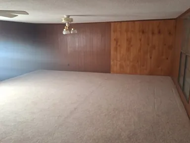 Inside, the home includes a mix of hardwood flooring and carpet, along with ceiling fans that enhance airflow throughout the living areas. A wood-burning fireplace adds character and seasonal warmth, contributing to a comfortable atmosphere.