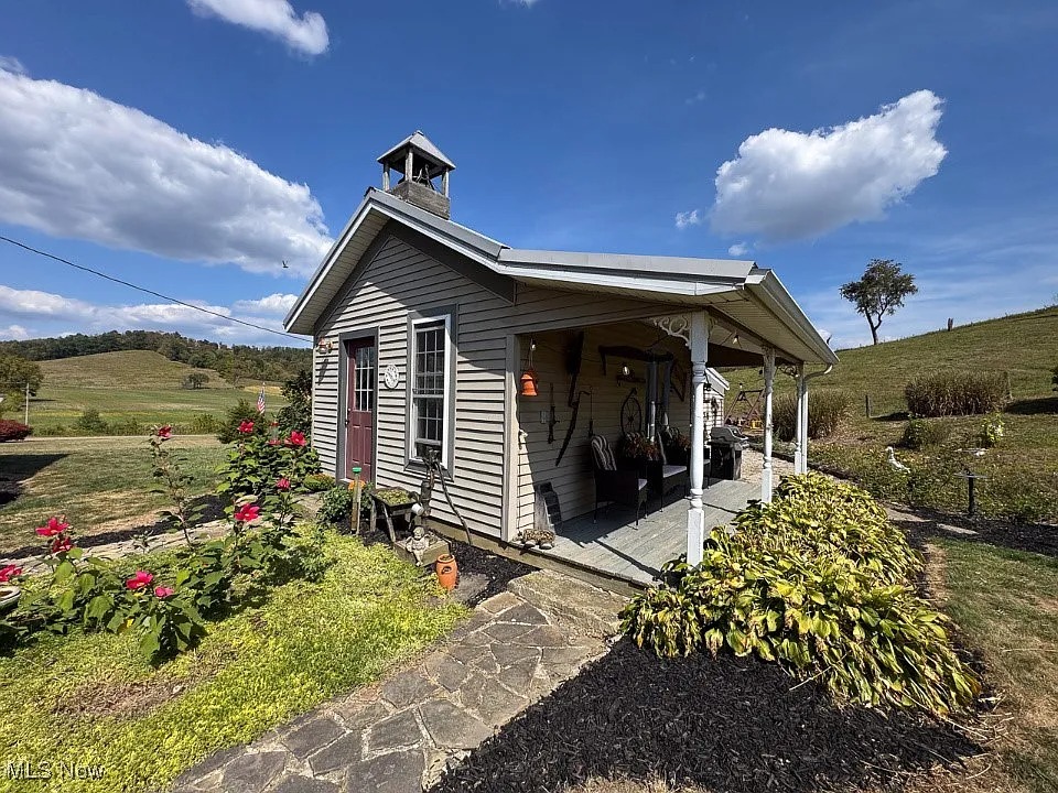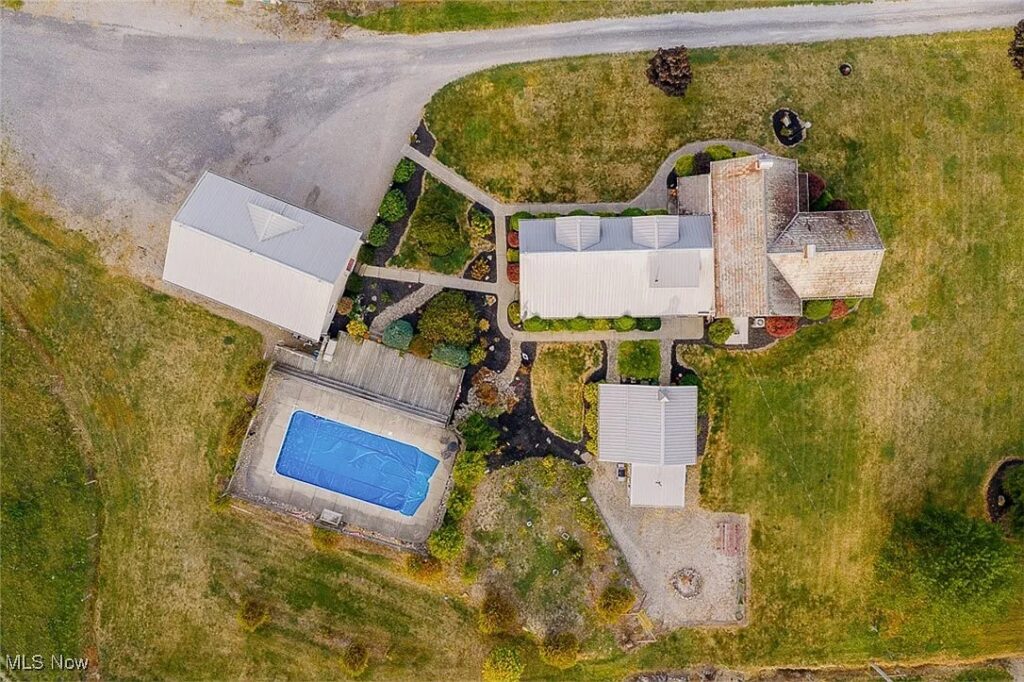Multiple outbuildings enhance both the utility and historic appeal of the property. These include a heated three-bay garage, a classic bank barn with a stone foundation, a hog house, and a chicken coop. Outdoor amenities feature covered porches, a heated in-ground pool with a surrounding deck and waterfall, and sweeping countryside views. Free natural gas services the home, pool, and garage, adding significant value and efficiency.