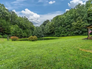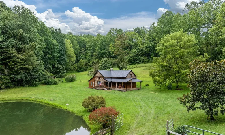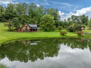 Step onto the front porch and you are greeted by a scene that feels straight out of a postcard. A lush, grassy meadow gently slopes away from the cabin, leading your eyes down toward one of the property’s most captivating features—a spring-fed pond that anchors the landscape.
