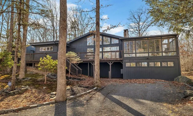 A striking raised‑ranch, mid‑century modern retreat set on a scenic 1.34‑acre lot in Conashaugh Lakes.