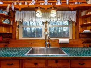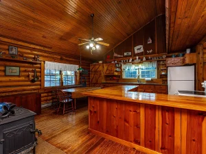 The spacious kitchen is thoughtfully designed for both functionality and ease. With ample workspace and storage, it supports everyday cooking as well as special occasions. Natural light filters in, highlighting the warm wood tones and reinforcing the home’s timeless cabin aesthetic. This is a kitchen where meals are prepared with intention, where coffee tastes better in the morning, and where simple routines feel meaningful.